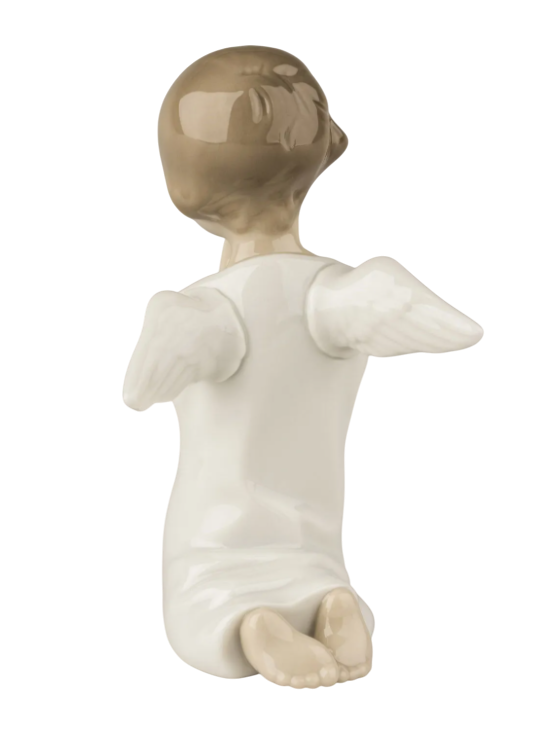 Figura splendente angelo in porcellana pregando in ginocchio. La tenerezza, la grazia e la purezza si trasformarono in delicate porcellane. Una dimostrazione di come così tanti sentimenti possano essere trasmessi in un pezzo così semplice.