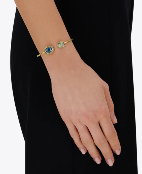 Bracciale a schiava dell' iconica collezione Reverse in oro giallo 18 kt. con pietre preziose e doublette di topazio blu e madreperla.