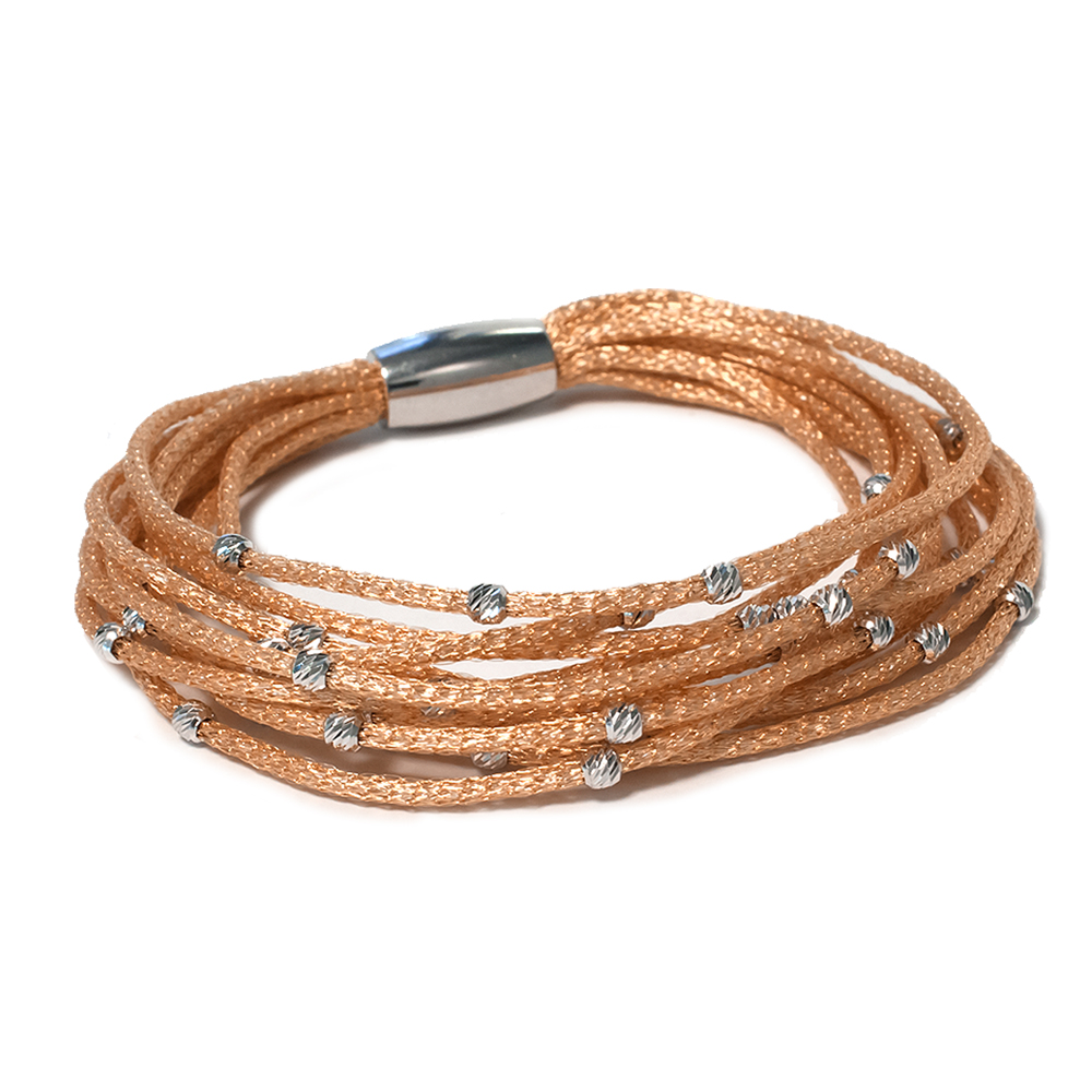 Bracciale in filato metallico smaltato con elementi in argento 925 lucido, 12 fili. Chiusura a boule magnetica ed estensione in argento 925